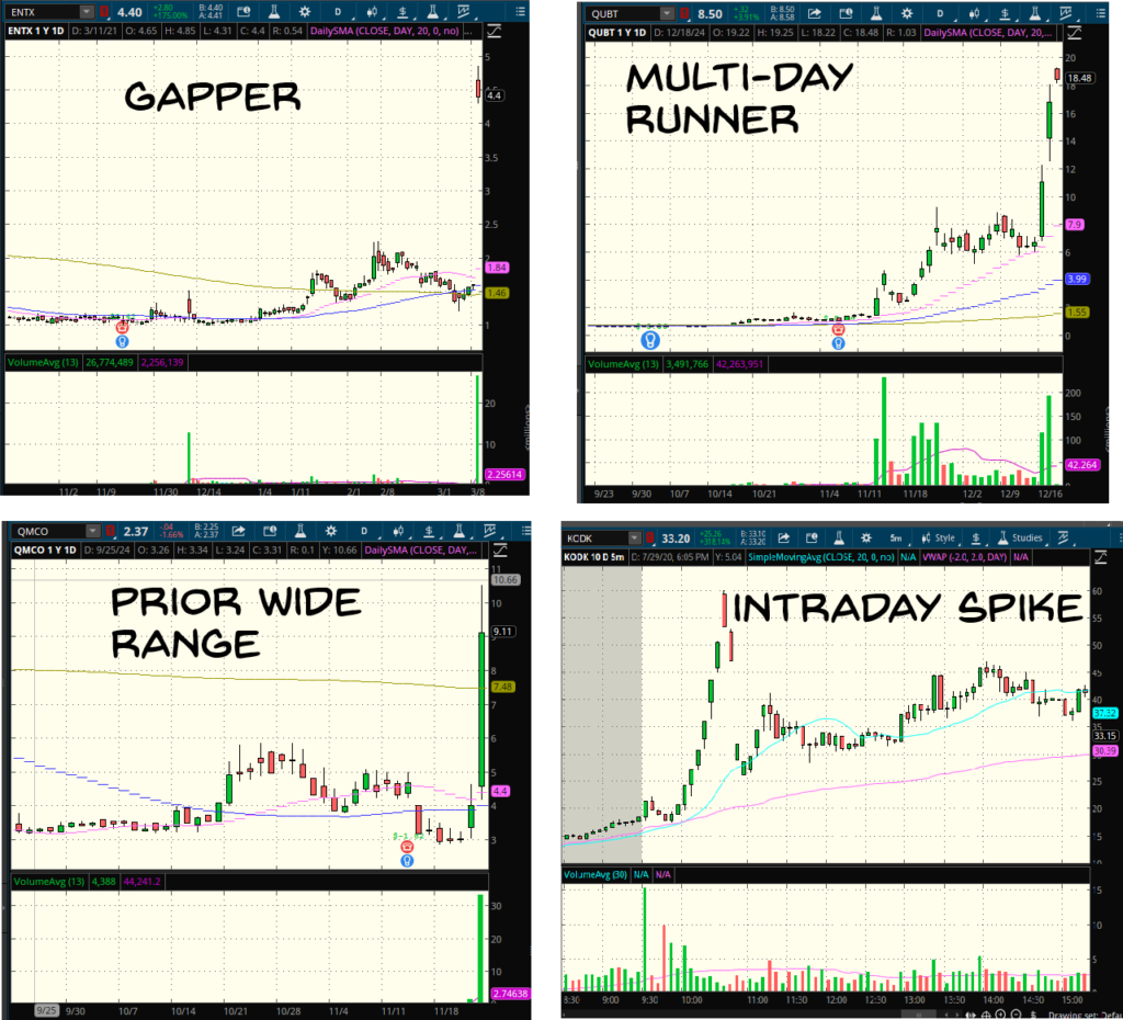 To build his scan, he began with a clear goal: how can I quantify the setups that consistently lead to the most impressive “chart porn” outcomes? He started by identifying trades that he believed met a specific aesthetic ideal—those with standout outcomes from a trigger, like fading all day to a distant target–and then label them under a specific trading context. For each instance, he recorded the stock symbol and date in a spreadsheet.