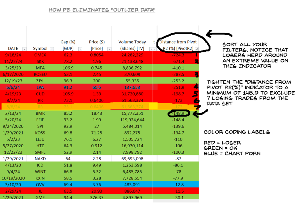 It’s like working backwards. He wants a certain data set–all winners and no losers–and then he works the filters until he can get as close as possible. Later on, he would even start checking real-time scan candidates in the morning to see if any of its data was on an extreme end of a “relevant filter” and then red flag those candidates.