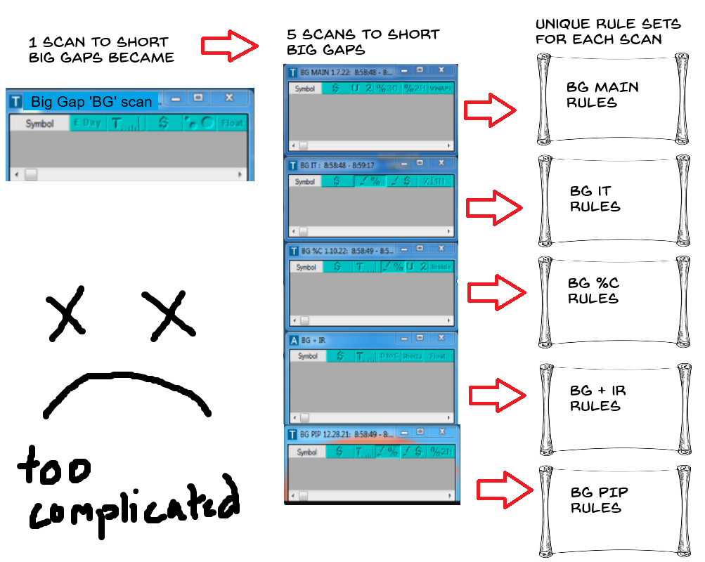 This idea of trying to perfect every little aspect of scan had completely consumed the Professor. It wasn’t just manipulating the data set. He started to sub-divide his own scans and create different rule sets for every variation. You would have “Gapper Scan A” and “Gapper Scan B” that are almost identical with 49/50 shared filters but “for reasons unknown”, they had two entirely different rule sets. If one were to look ‘under the hood’ at each chart for each data set, would you find any obvious, distinguishable differences that required all this sub-categorization? No.