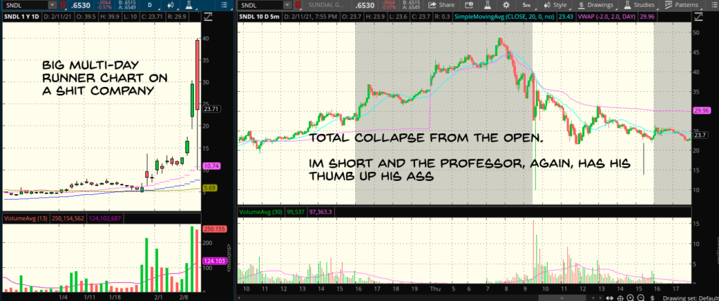 Then there was this marijuana junk stock called SNDL. It had a massive float that ran from 10 cents to 5 bucks over a few days. It was the shittiest company ever as well as a clear and obvious parabolic chart. It was 100% the type of stock that *should* be on the PB’s multi-day runner scan. But it wasn’t (or it was, but with weird outlier red flags or it didn’t meet some overly complicated entry criteria). Perhaps you can attribute this miss to over-optimization. I didn’t care. I hit the bids early and made six-figures. After the closing bell, the red-faced Professor wrote a goddamn 1000 word dissertation about how SNDL will never be a missed trade again, going forward. Cool beans, bro.