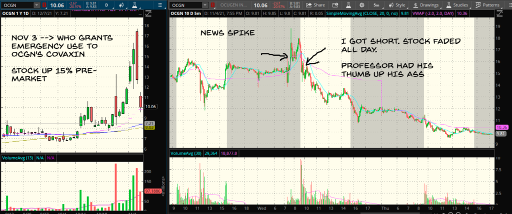 There was a small biotech stock, OCGN, that ran hard into a covid emergency use announcement and the stock set up for a sell the news play. You can see this market phenomenon all the time. PB chooses not to acknowledge this–he wants trading to be strictly scan and charts. According to him, events are superfluous to the so-called “author” of the markets. I didn’t give a shit and I shorted OCGN to catch a beautiful stock porn move–classic all day fader. After the close, one of the newer traders had asked PB about why OCGN wasn’t on scan and he got extremely defensive, denying that the stock had any context to it simply because it wasn’t on his meticulously backtested scan. His attitude that the entire truth of the market lied solely within his scan–that rubbed me the wrong way.