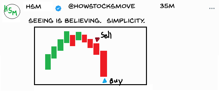 The twitter ecosystem of finance experts had grown exponentially since 2011. Every trading guru wanted to make their impression with gaudy PnL or lifestyle porn like sports cars and luxury watches. Almost all of them repulsed me except one… I observed this one particular account, twitter handle @HowStocksMove, who would consistently post impressive and realistic trading execution screenshots. He kept it simple and often kept to 1-2 entries & exits at most at a time when the “en-vogue” daytrading thing to do was to scalp within a position as often as possible. His execution points made intuitive sense to me. The tweets accompanying his charts were often infuriatingly pithy, like this: