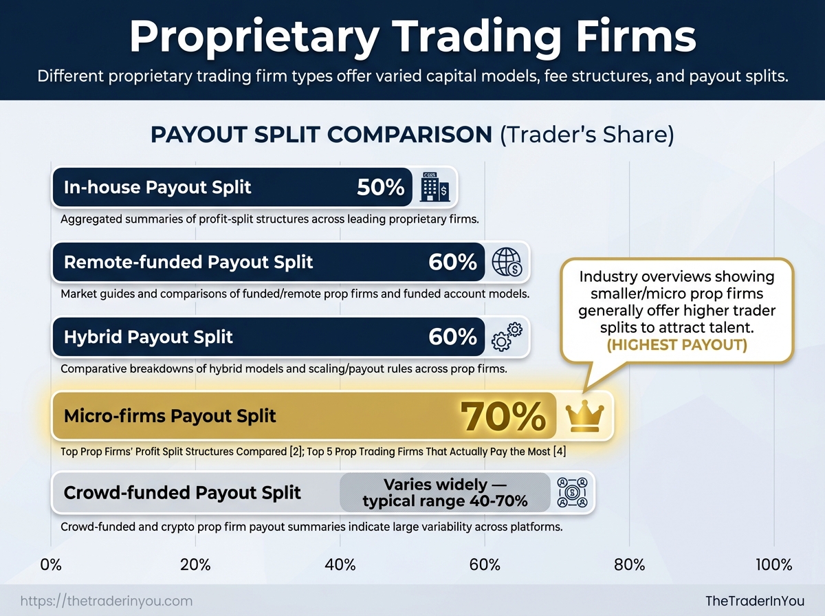 | Micro-firms / boutique prop shops | Small firm capital, niche strategies | Small teams or single traders | Minimal fees; profit splits or salary hybrids | 30–70% depending on arrangements |