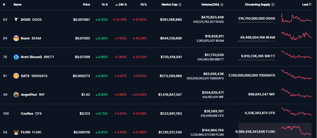 While old dogs like Bitcoin and Ethereum are down on the weekly and daily timeframes, the dog-themed memecoins (and most other memecoins for that matter) are faring no better. DOGS and BRETT are among the biggest losers with -31% and -22% on the weekly chart.