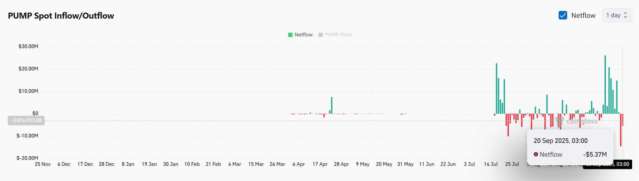 Whale activity of such scale often creates ripples, amplifying sentiment around sustained appreciation in PUMP price. Moreover, netflow data reflects consistent outflows, including a $5.3 million exit on September 20, reducing exchange supply, according to CoinGlass.