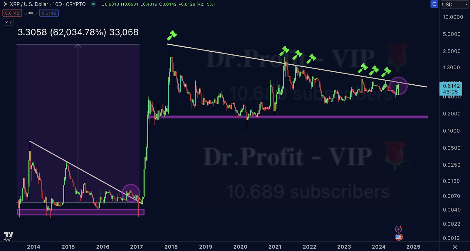 The pundit highlighted a key resistance level at $0.72, noting that breaking through could signal a significant bullish trend, with potential targets above $1 by early 2025. Doctor Profit also pointed out that if XRP mirrors its 2017 performance, the price could reach as high as $16.