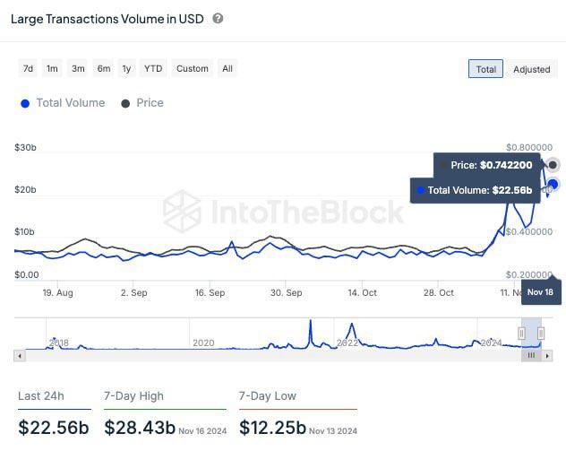 Meanwhile, on-chain data reinforces the growing bullish sentiment around ADA. Analytics firm IntoTheBlock revealed a staggering 300% surge in large Cardano transactions over the past two weeks, signaling increasing interest from institutional players. For context, the total volume of these high-value transactions reached an impressive $22.56 billion, highlighting the scale of activity driving Cardano’s ongoing rally.