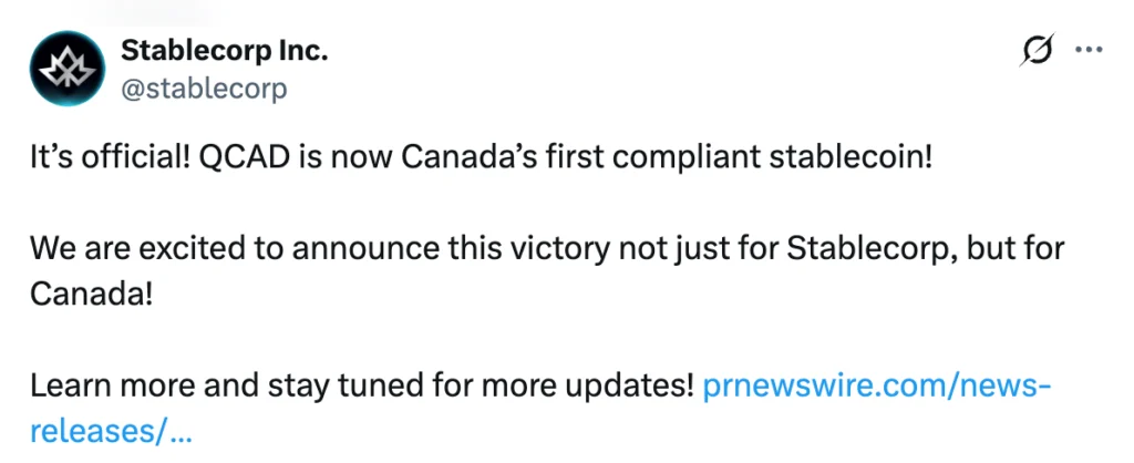 Stablecorp revealed in its announcement that it has been engaged in a regulatory approval process for years. It recently obtained a final receipt for its prospectus and can now legally distribute the QCAD tokens under Canada’s stablecoin regulatory framework.