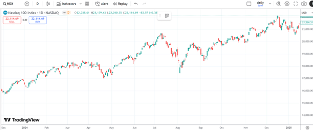 The Nasdaq-100 (NDX) had an upward-sloping curve of a gain of 26% in 2024.