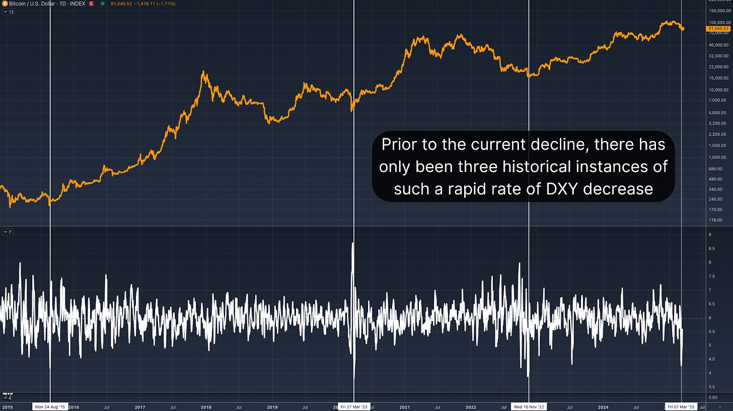 Currently, the DXY has been in a sharp decline, a decrease of over 3.4% within a single week, a rate of change that has only been observed three times in Bitcoin’s entire trading history.