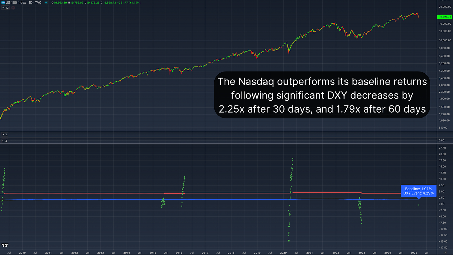 Interestingly, this pattern isn’t limited to Bitcoin. A similar relationship can be observed in traditional markets, particularly in the Nasdaq and the S&P 500. When the DXY retraces sharply, equity markets have historically outperformed their baseline returns.