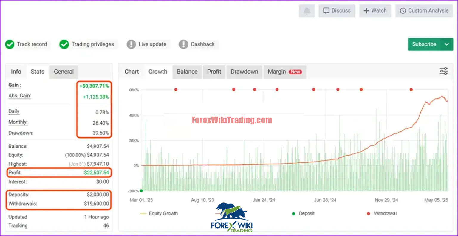 ⚠️ Red Flag: The +50,307% “gain” appears inflated—likely due to compounding micro-lots. The absolute gain (+1,125%) is a more realistic metric.