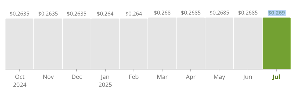 On 19 February, Realty Income (O) increased its monthly dividend by 0.19%, from 26.85¢ to 26.9¢ per share.
