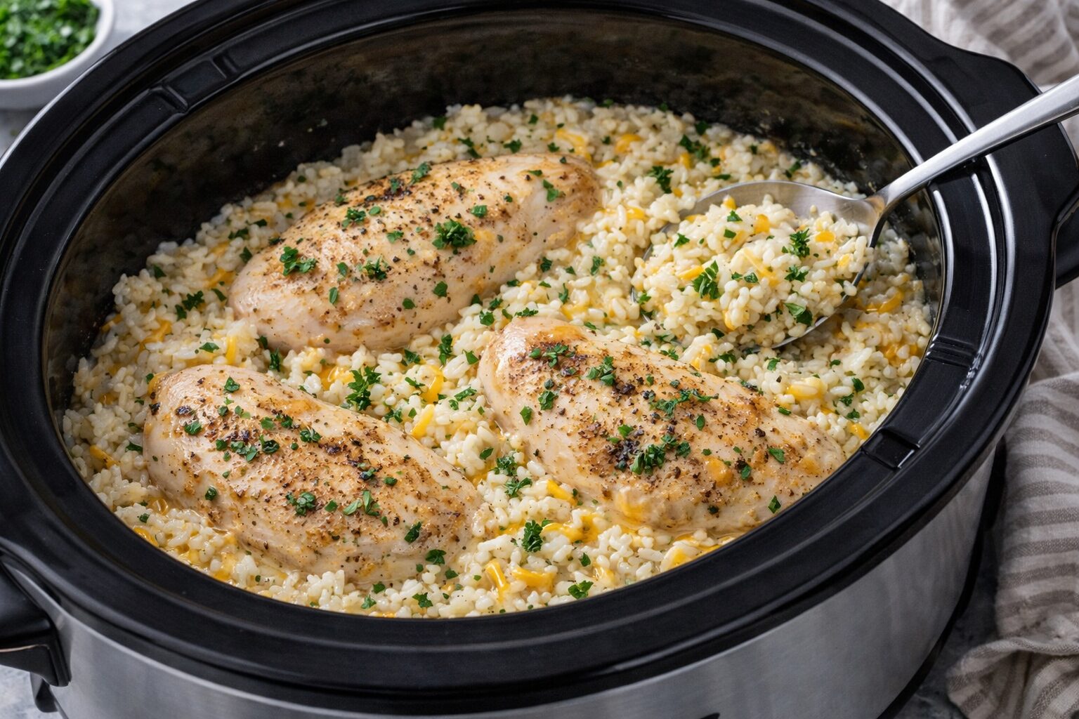 When you’re tired from a long day, let the slow cooker do the hard work. This slow cooker chicken and rice dish is a life-saver. All you need is some chicken breasts, rice, and a can of chicken stock to create a savory, comforting meal that cooks while you relax.