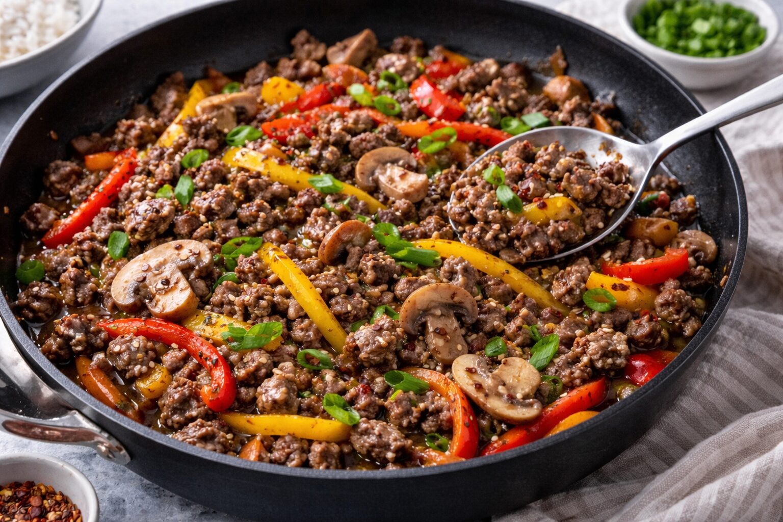 Cook the ground beef in a skillet, add the veggies, then toss everything together with soy sauce and garlic. It’s that simple!