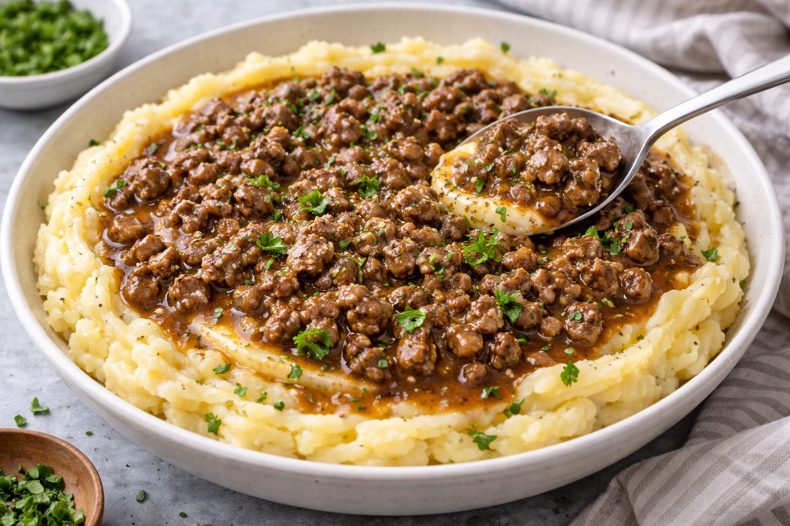 First, make the mashed potatoes, then brown the ground beef. Add the stock to make a savory gravy, and serve it all up together. It’s an easy dinner packed with comfort.