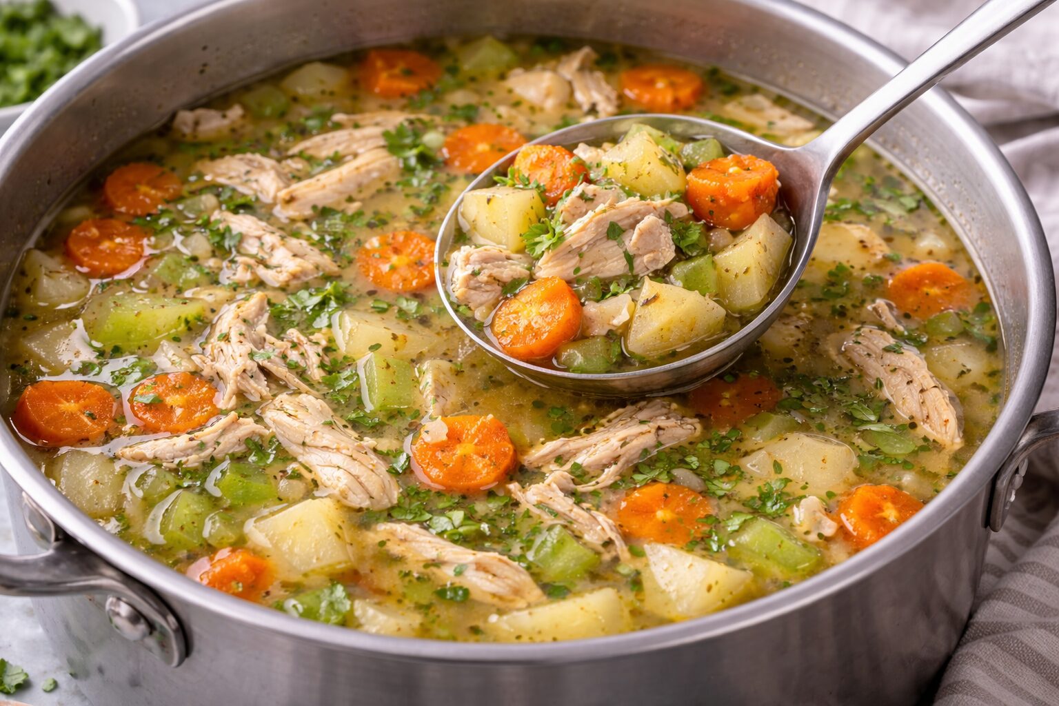 Looking for something warm and comforting? This chicken soup is loaded with veggies, perfect for a busy weeknight. Chicken stock, carrots, onions, and potatoes come together in this savory soup that’ll leave you satisfied and cozy.
