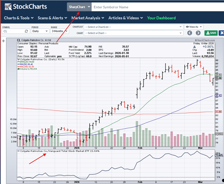 I’ve entered the symbol CL for Colgate-Palmolive and have configured a relative strength panel beneath the chart.