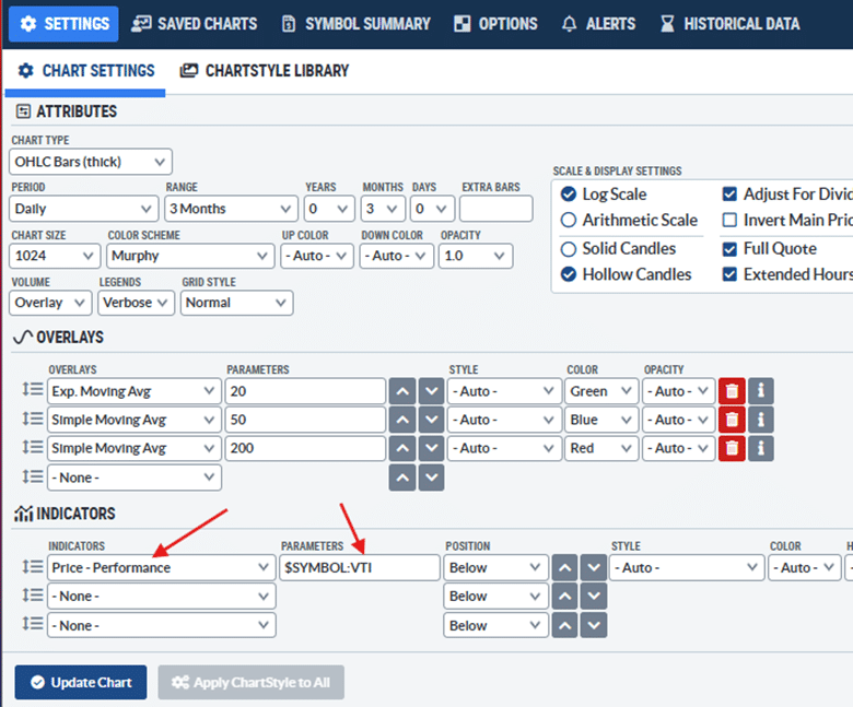 StockCharts displays a Relative Strength line that compares a stock’s price to a benchmark such as VTI.