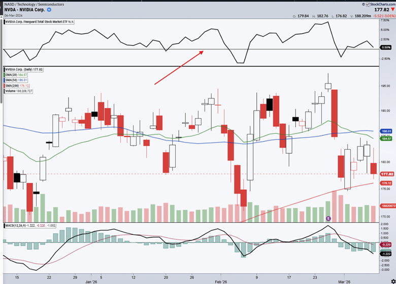 The relative strength line shown on charting platforms makes this comparison easy to visualize.