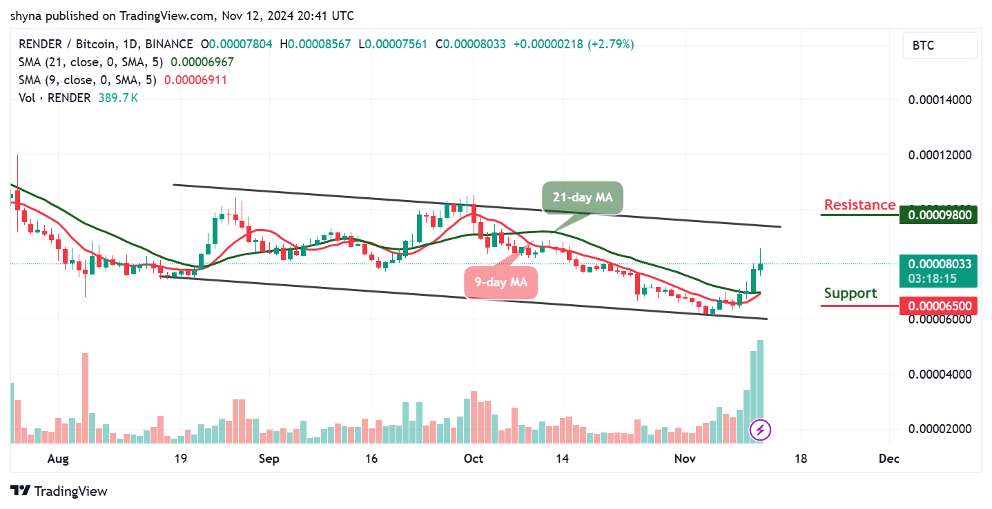 At the time of writing, the Render price is likely to spike to the upside if the bulls increase the pressure. However, if the coin slides below the 9-day and 21-day moving averages, the market price could face the channel’s lower boundary. But if the price crosses above the upper boundary of the channel, traders can then expect a bullish continuation toward the upside as the possible resistance levels could be found at $9.0, $9.5, and $10.0.