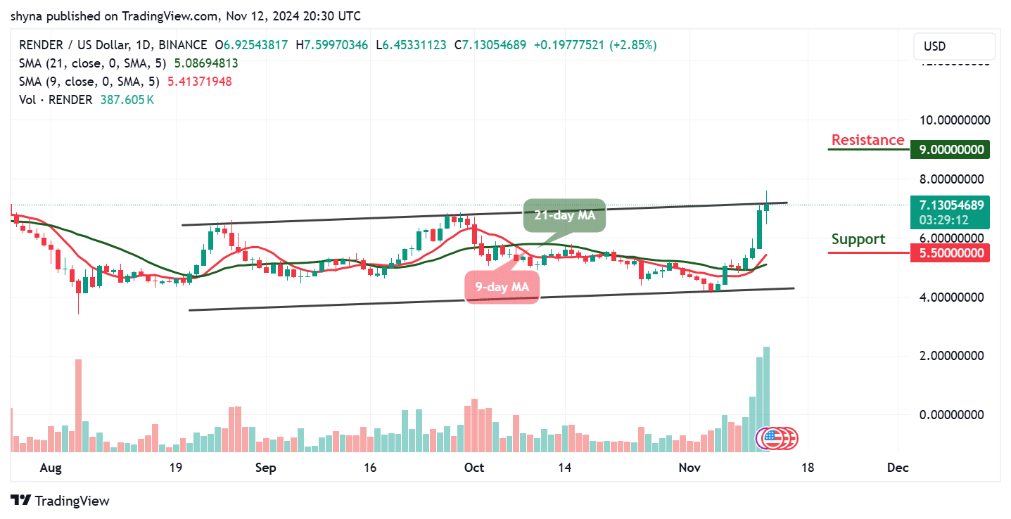 Nevertheless, the presence of new long positions and the liquidation of short positions around resistance levels may create buying pressure, reinforcing the bullish trajectory. However, as buyers maintain support, Render could push toward its next target of nearly $7.6, with the potential for further gains if this momentum persists. Meanwhile, RENDER/USD can still drop below the 9-day and 21-day moving averages, and, a bearish extension could roll the coin to the long-term support at $5.5, $5.0, and $4.5 levels.