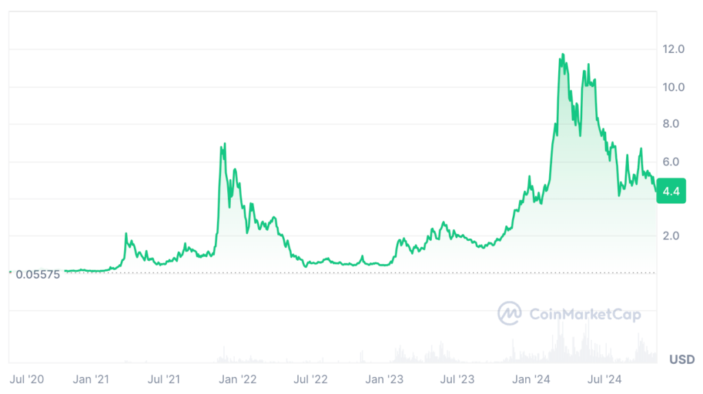 - 2024: As of 2024, RENDER has shown resilience, with gradual recovery and renewed interest as the demand for decentralized rendering solutions continues to rise, particularly in sectors like gaming and virtual reality. In March 2024, during the bullish market, RENDER hit its all-time high of $13.6. At the moment, it trades between $4 and $6.