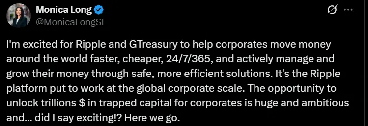 With GTreasury integrated into Ripple’s infrastructure, corporations could use XRP for instant global payments, reaching settlement in seconds.