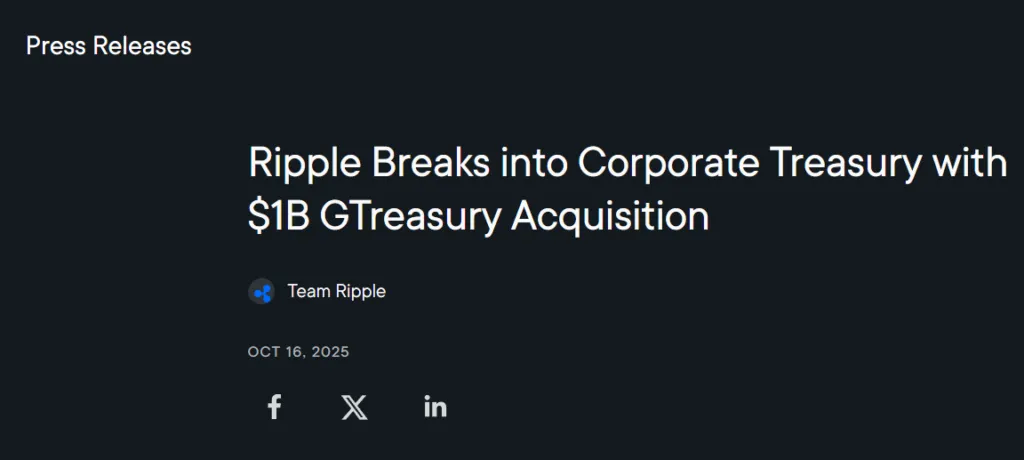 Ripple has announced a $1 billion acquisition of GTreasury, a leader in treasury management systems, marking another acquisition for Ripple after buying Hidden Road in April.