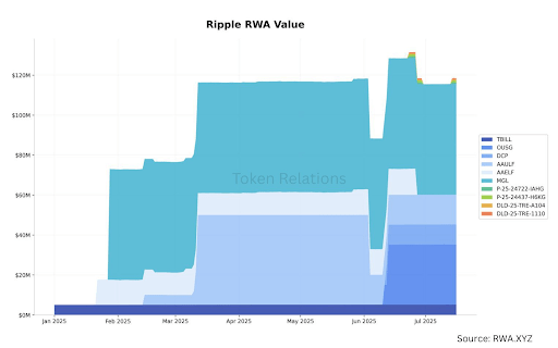 According to the data in the image below, Ripple’s RWA value started 2025 around $5 million, with the majority coming from OpenEden’s T-bills on the XRP Ledger. However, this value is now sitting around $118 million with many other tokens of real-world assets.