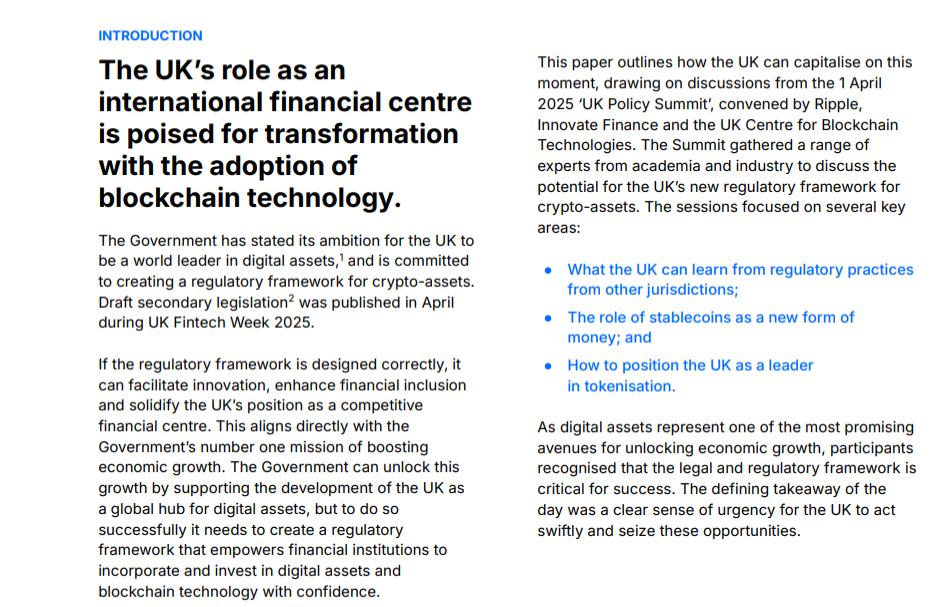 Ripple (XRP) has released a new report outlining how the United Kingdom can embrace and integrate digital assets and stablecoins, positioning itself as a global leader in the evolving financial landscape.