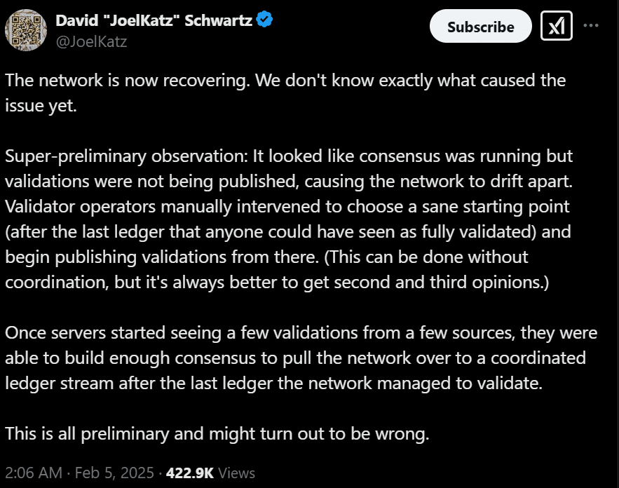 - The XRP Ledger faced an hour-long outage on the 5th of February.