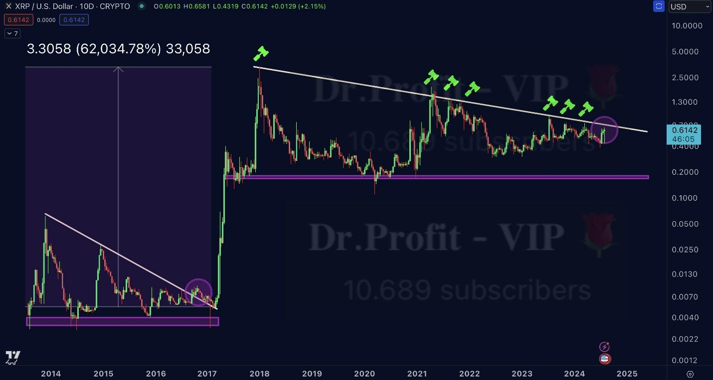He noted that the XRP price is testing crucial resistance levels inside the 6.5-year-long symmetric triangle pattern, and breaking through these barriers could set the stage for a significant upward movement, suggesting a potential price target of $16, based on historical patterns and Fibonacci levels.