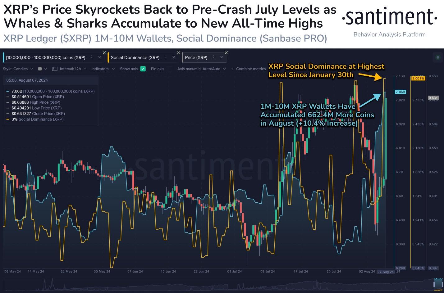 Santiment analysts also reported a 23% increase in the XRP market cap, with wallets holding 1 million to 10 million XRP now holding a record 7.06 billion coins, valued at $4.42 billion. According to the firm, social media discussions about XRP also surged to their highest levels since January, reflecting heightened investor interest.
