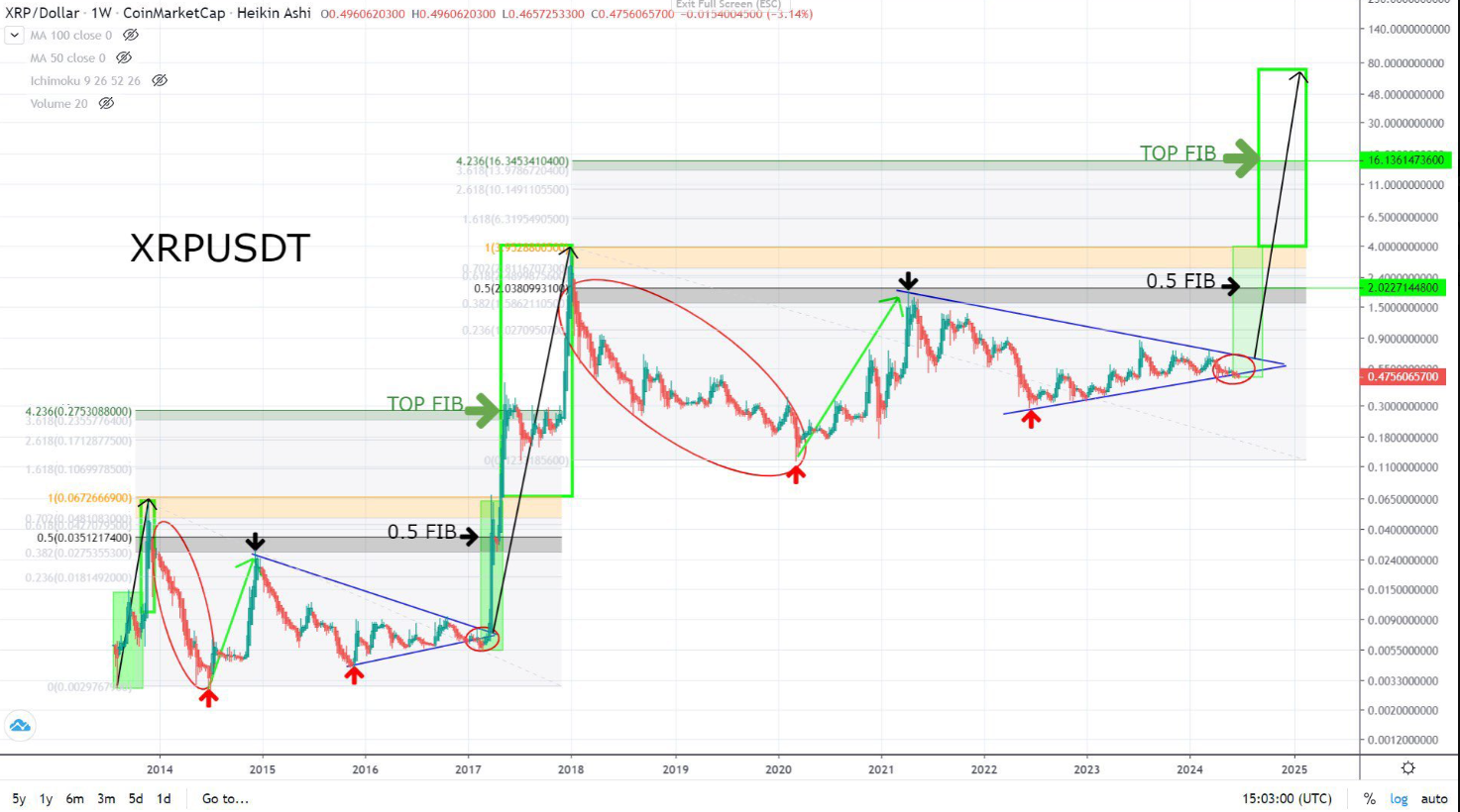 If the previous patterns repeat, the analyst predicts that XRP will rally to test the $2 resistance level before rallying to a top Fibonacci level at $16.
