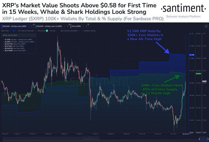 Santiment acknowledged that heightened shark and whale holdings were instrumental in enabling XRP to scale heights, with the altcoin hitting a 15-week high.