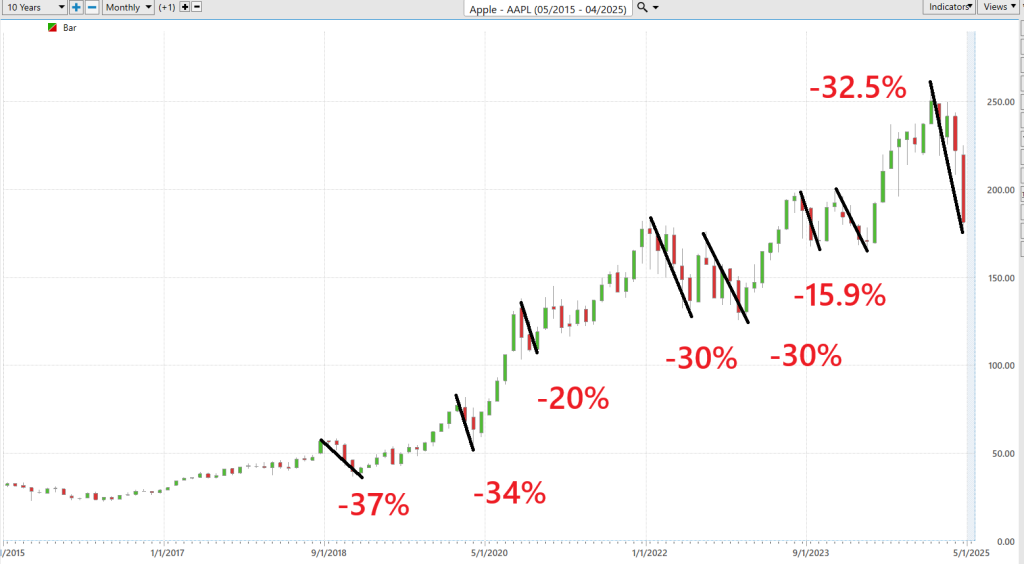 When I eyeball the $AAPL stock chart, I’m not just seeing a bunch of ups and downs — I’m seeing a goldmine of clues on when to make my move. Over the last decade, this tech juggernaut has had its fair share of tumbles, but here’s the kicker: the biggest nosedive was a heart-stopping 37%. Close on its heels was another gut-wrencher at 34%. And just recently, during the latest market freakout, $AAPL took a 32.5% plunge from its peak.
