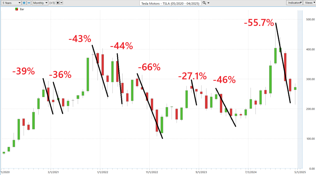Here is what the RISK RADAR worst case scenario looks for Tesla ($TSLA). By measuring the magnitude of the declines, we can quickly recognize that the most recent decline was the second largest uninterrupted decline over the last 5 years. We can also see how volatile $TSLA has been as a stock. This analysis is not done to try and pick a bottom of a market. It is done for the purpose of maintaining a cool perspective when the markets are in turmoil. Listen up, when markets hit those wild extremes, they don’t just keep barreling on like a runaway train. Nope, they pause to catch their breath, or they snap back hard in a rally. It’s like they hit the wall at the end of a blind alley and have to make a quick decision, stand there dazed or turn around and sprint the other way.