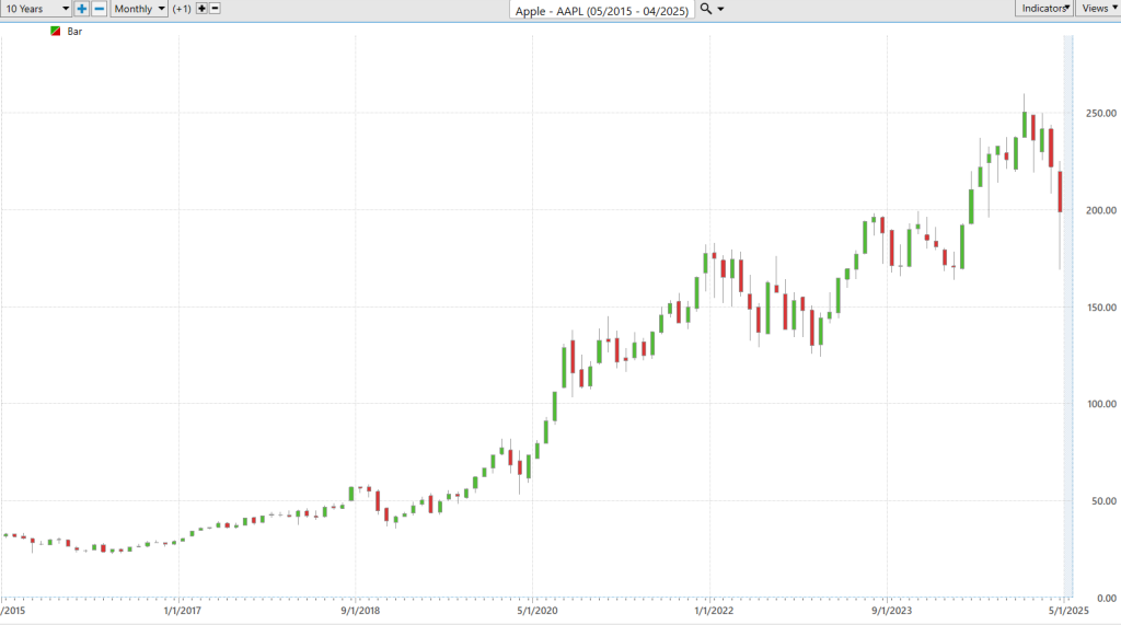 Let me explain this concept by looking at the history of Apple (AAPL). Here is a chart of $AAPL going back 10 years. What is it that you see when you first look at this chart?