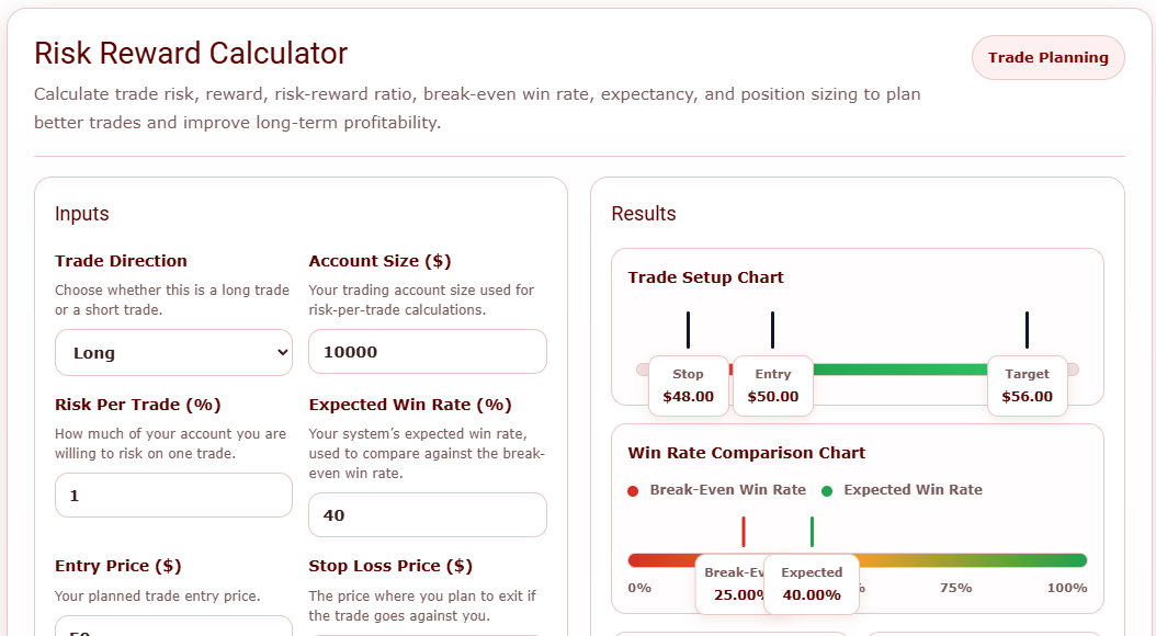 Use the webs most advanced Risk Reward Calculator to calculate trade risk, reward, break-even win rate, and position size so you can plan profitable trades with better discipline.