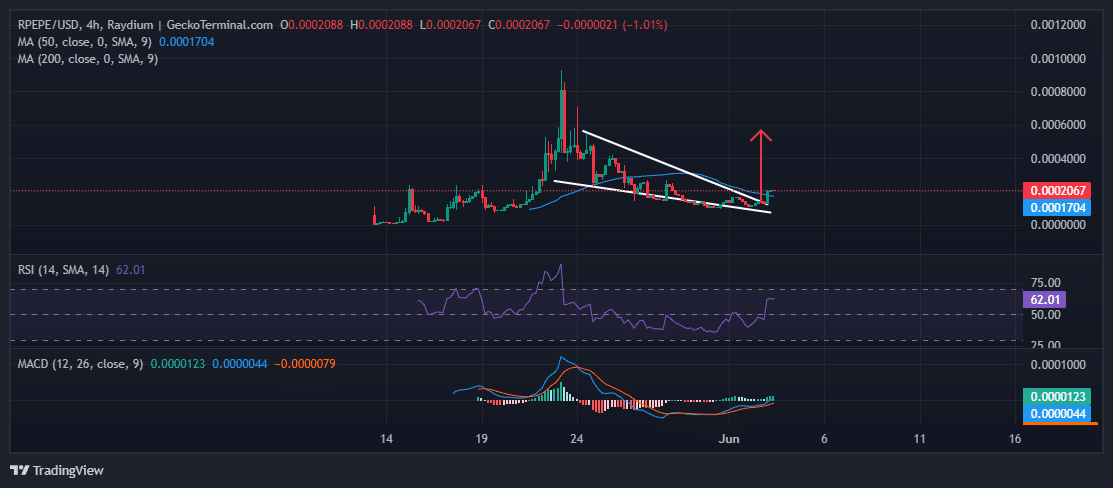 However, after Gill’s reappearance, RPEPE used the $0.00010 support to push the price over the upper boundary of the wedge.