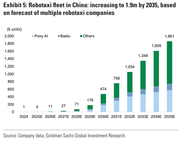 Goldman Sachs Research analysts believe that with 500,000 robotaxis expected to be operating across 10+ cities in China by 2030, the shifting the question from “if” to “how” companies will commercialize this technology.