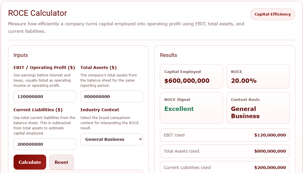 Using our ROCE Calculator is simple. Enter the company’s EBIT, Total Assets, and Current Liabilities. The calculator will then estimate capital employed and show the company’s ROCE as a percentage.