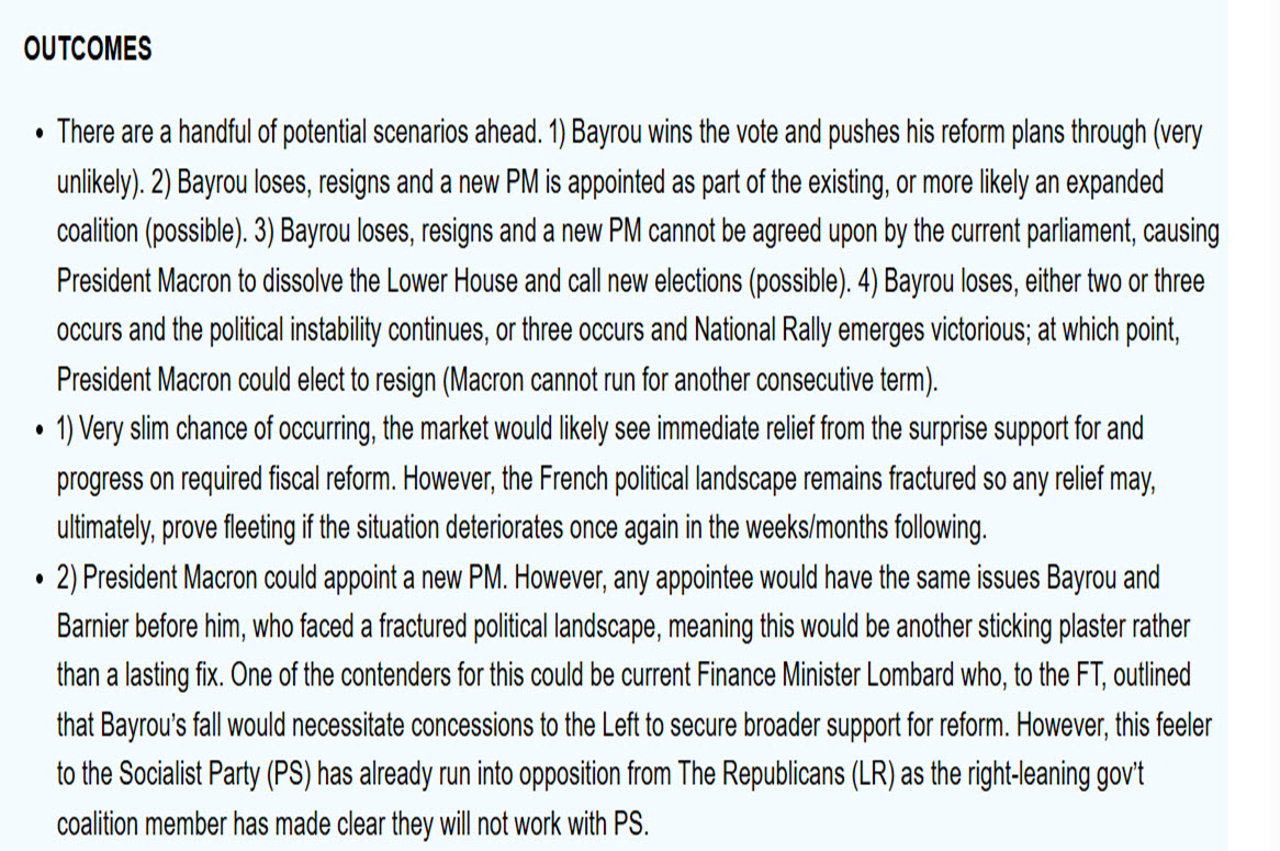- Dissolve Parliament and call new elections, an option that could reshape French politics entirely. This is the least likely outcome that would produce thew biggest surprise.