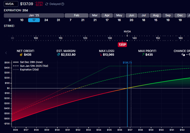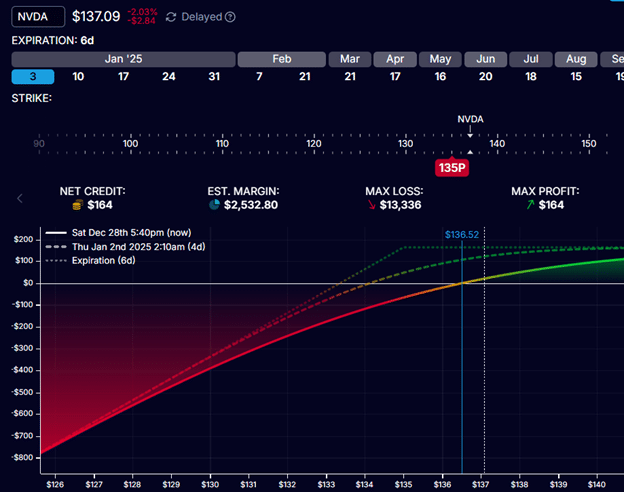 With the short put strike at $135 and NVDA trading at $137, the investor may decide to give the trade more time, hoping that the stock would move higher so that he can close the short put for a profit without needing to get assigned.