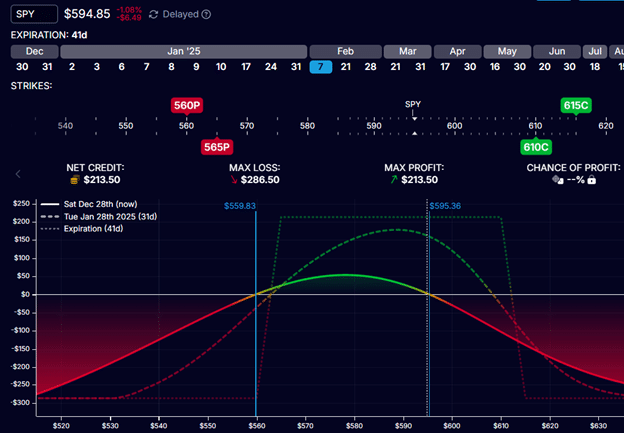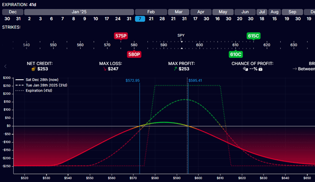 We have a bear call credit spread for the upper half with the short call at $610 and the long call at $615.