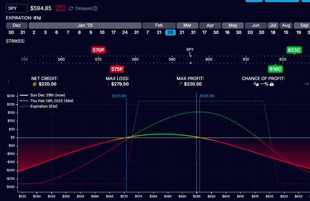 As we saw, by rolling the 565/560 put spread to 580/575, we would get a credit of $39.50, resulting in the following new condor.