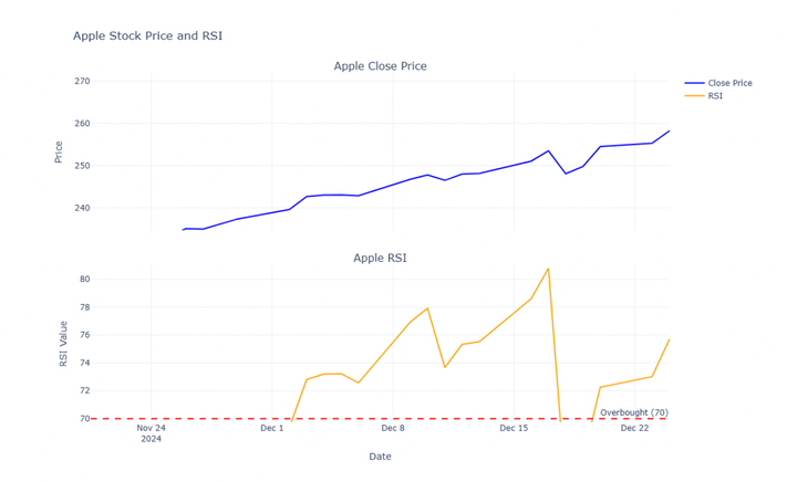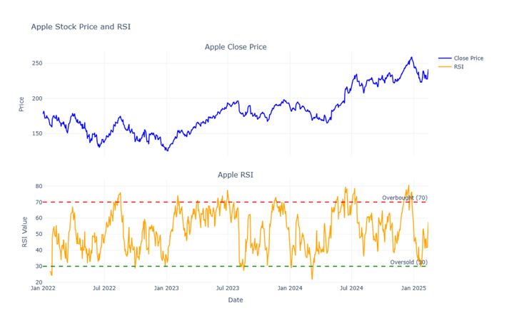 While it seemed complicated to calculate the RSI indicator values manually, Python has really made it simple (and faster) to calculate the RSI values of any asset, as well as visualise it. For the demonstration, we will be using Apple’s OHLCV data from the period Jan 2022 to February 14, 2025. Further, we will use the Close price data and calculate the 14-period RSI values of the asset. We will then use the python Plotly library for visualising the close price and RSI values together.
