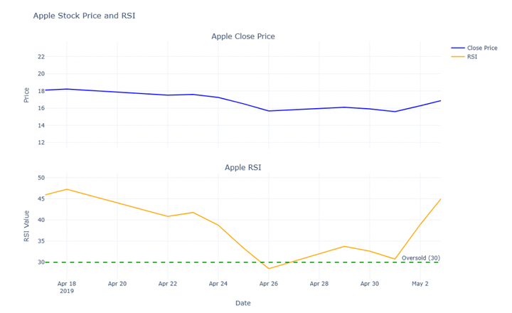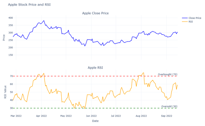 That’s it. Now you can check how many times the Apple stock price crossed the overbought and oversold thresholds of 30 and 70.
