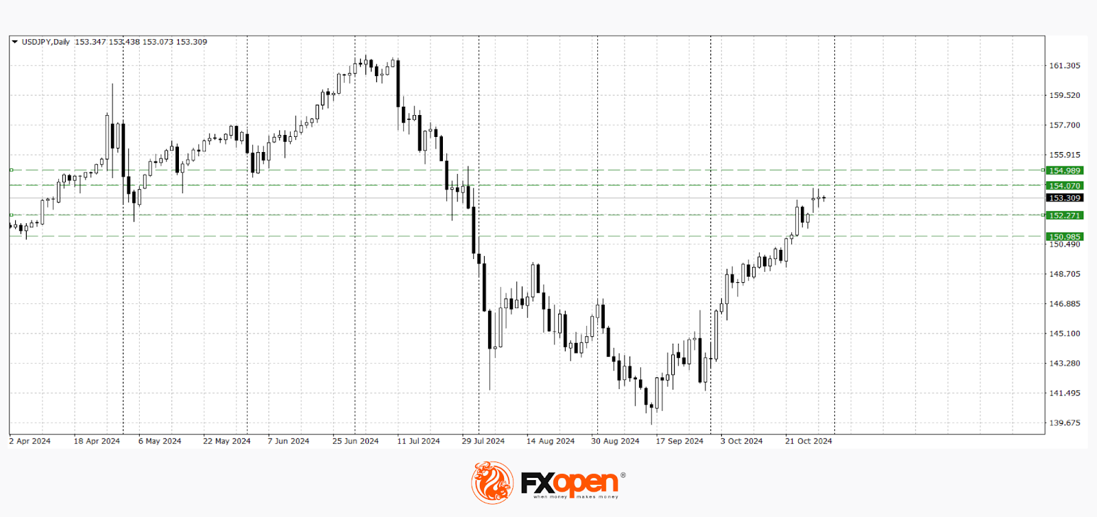 The rate differential between the Federal Reserve and the Bank of Japan, coupled with positive sentiment surrounding the upcoming U.S. elections, has fueled a sharp rise in USD/JPY. Over the past two weeks, the pair has gained more than 500 points, reaching significant highs of 154.00–155.00 this year.